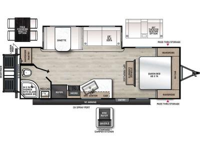 These travel trailers are built on a cambered structural steel l-beam frame and Norco electromagnetic powder coated chassis for added strength and durability. Camping will be easier than ever with a hot/cold outside utility shower, an electric tongue jack, and a "Leash Link" quick hookup D-ring to keep your furry friends safe. The interior includes brick style backsplash, solid surface kitchen countertops, Congoleum woodplank linoleum flooring, and many more comforts you'd expect to find at home!