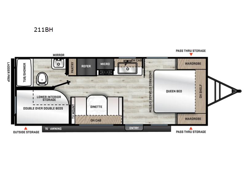 Sleeps 7 Length 25 ft 11 in Ext Width 8 ft Ext Height 11 ft 1 in Int Height 6 ft 9 in Hitch Weight 544 lbs GVWR 7544 lbs Dry Weight 4585 lbs Cargo Capacity 2959 lbs Fresh Water Capacity 44 gals Grey Water Capacity 40 gals Black Water Capacity 30 gals Furnace BTU 30000 btu Number Of Bunks 2 Available Beds Queen Refrigerator Type 12V GE Stainless Refrigerator Size 10.7 cu ft Cooktop Burners 3 Number of Awnings 1 LP Tank Capacity 20 lbs Water Heater Type Tankless On Demand AC BTU 13500 btu Awning Info 15' Electric w/Multicolored LED Light Strip and Remote Axle Count 2 Number of LP Tanks 2 Shower Type Tub/Shower Combo Electrical Service 30 amp Similar Floorplans